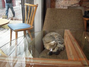 Mağazanın karşı köşesinde yer alan cafede ilk dikkatimi çeke şey, büyük bir keyifle mışıl mışıl uyuyan kedi oldu. İçerisi de son derece güzel dekore edilmiş, yine çok sıcak bir cafe idi. Adını almayı ihmal etmişim…Karşı koltuğumda kediyle birlikte güzel bir kahve içtim.