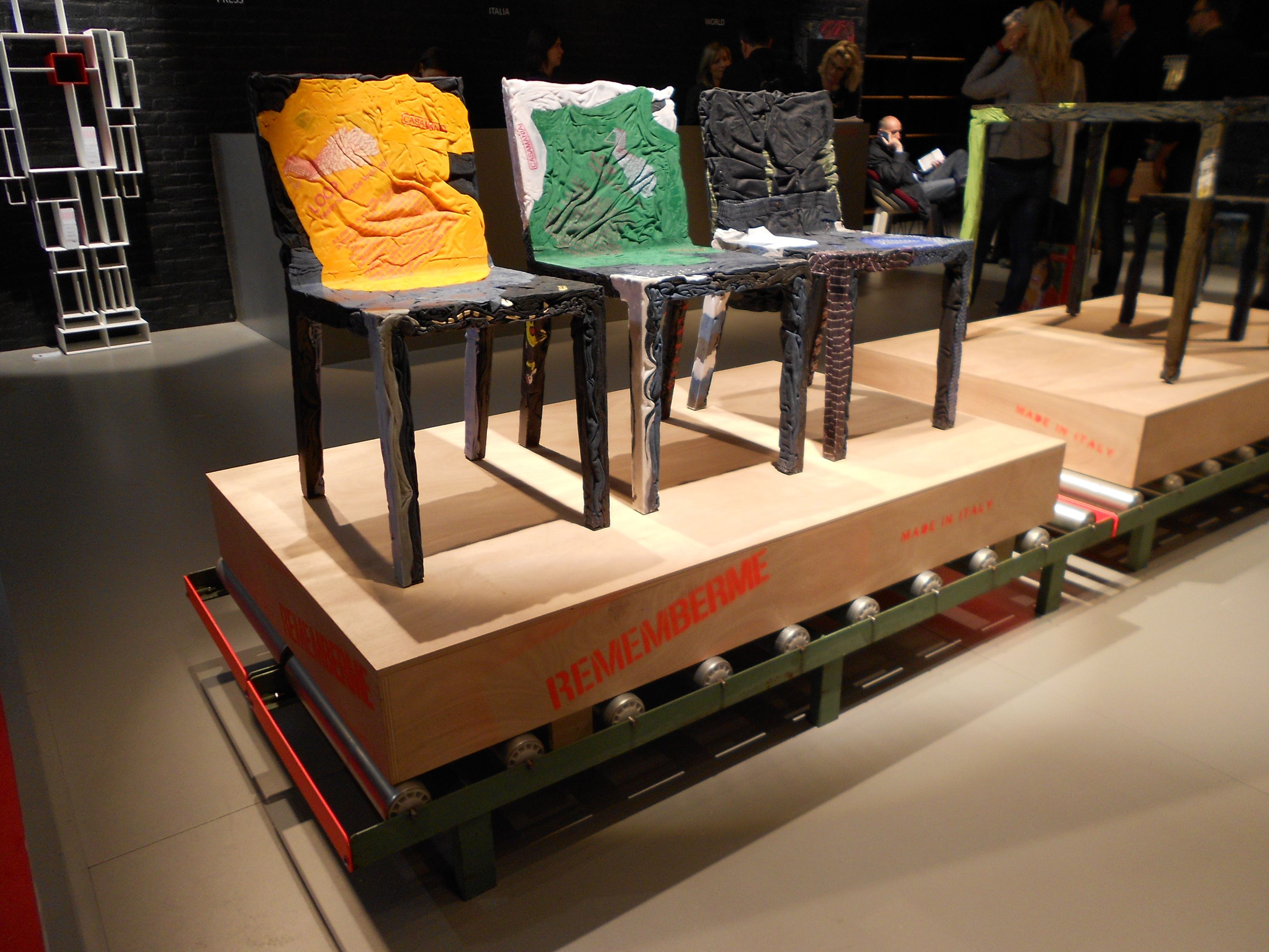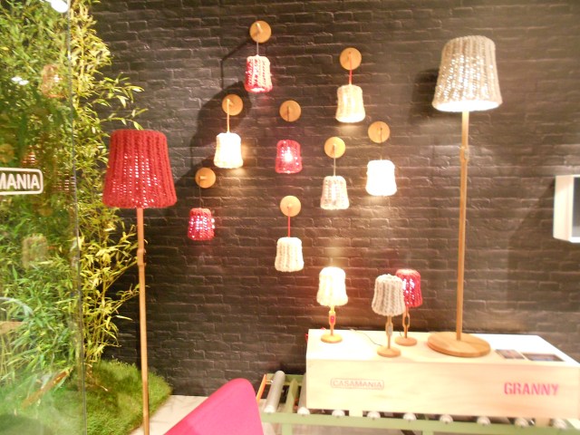 Casamania firmasından özel bir stand…İmalat bandı üzerinde sergilenmiş ahşap sandalye üstüne preslenmiş kot kumaş tasarımı ve el örgüsü şapkaları olan birbirinden şirin aydınlatmalar