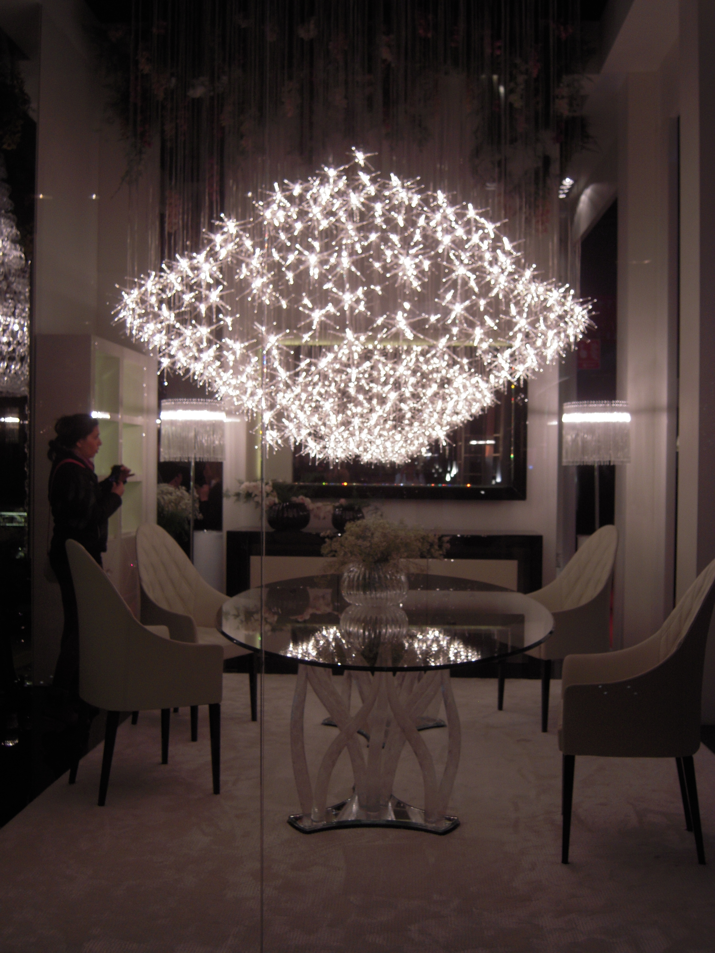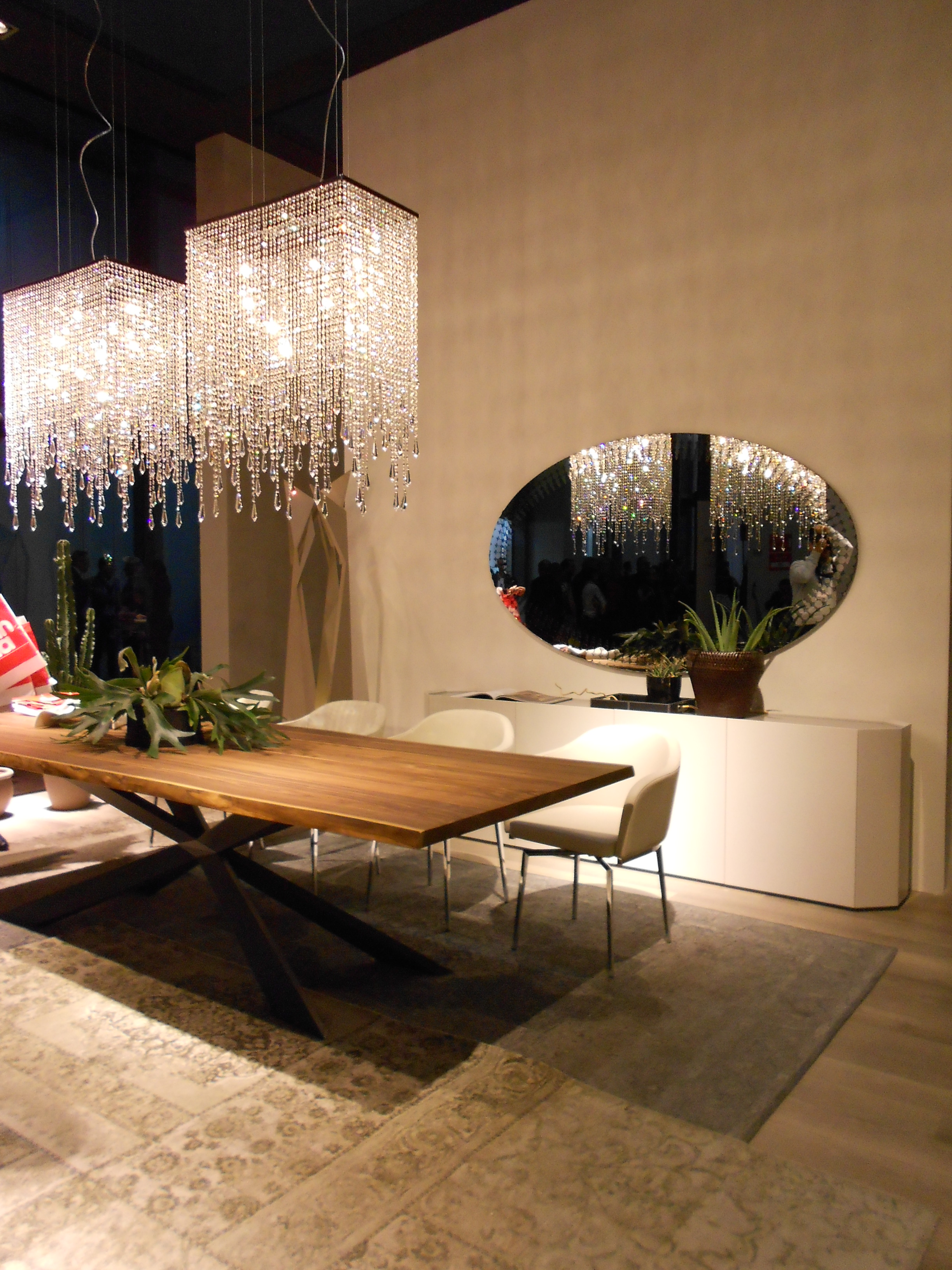 Cattelan Italia firmasından masif ahşap tablalı, metal ayaklı yemek ması üstüne şıkırtılı swarovski aydınlatma