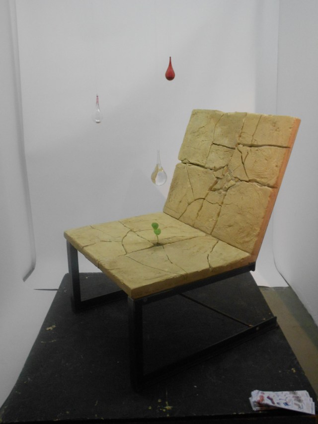 Toprak kullanılarak yapılmış sandalyede, kuraklığa rağmen yaşam savaşı veren bir tanecik bitki ve son su damlaları yansıtılmıştır.