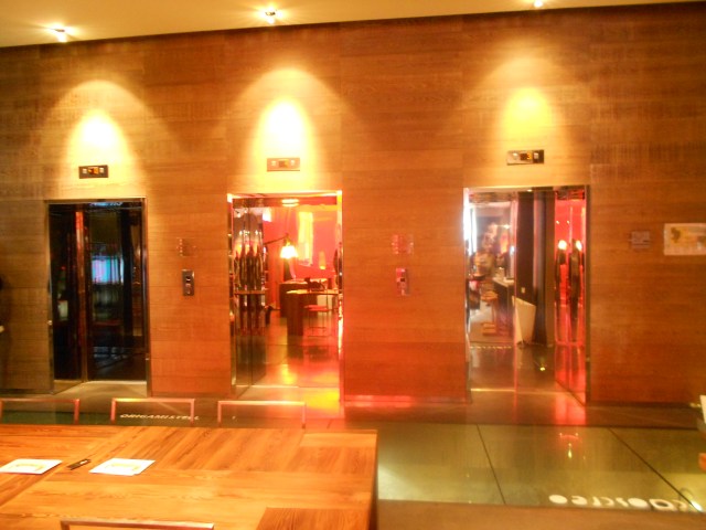 Asansör alanı önü zemini alt katı gösteren cam, duvarlar ahşap parke kaplama, kromaj asansör çerçeveleri ile şık bir ambians yakalanmış.