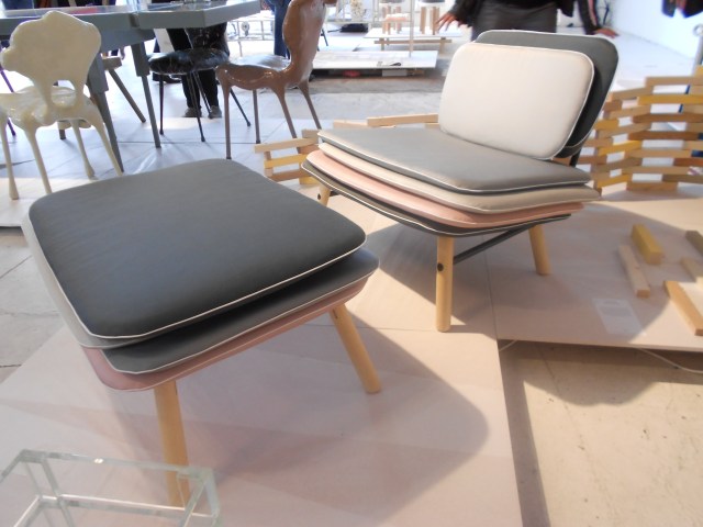 Üstüste ince yastıklardan oluşmuş sandalye-puf takımı