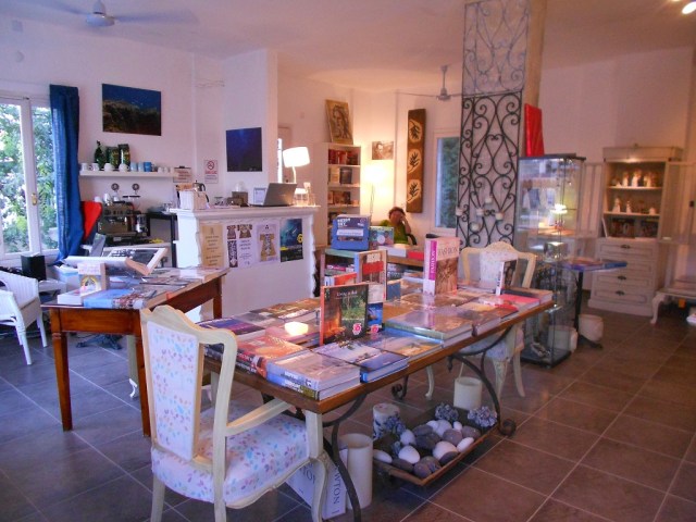 Mekan sahipleri üst katta yaşıyor, orta kat yani giriş katı kitapçı ve yarı bodrum kat ise ufak bir sanat galerisi.