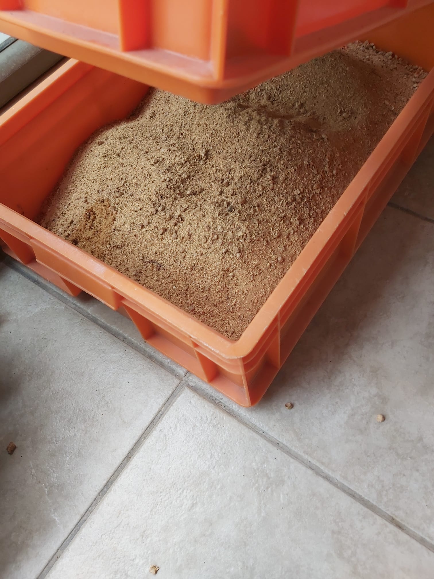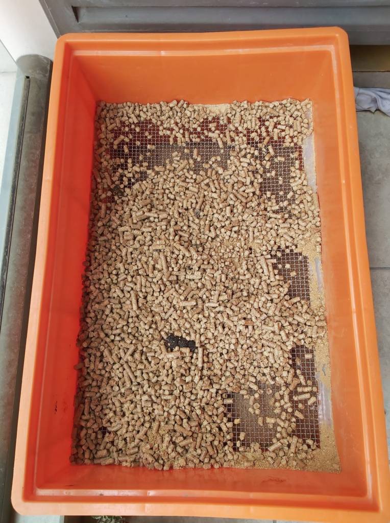 Bu soruna evde kendimiz bir çözüm ürettik, resimdeki gibi 2 adet istiflenebilir plastik sert kutuyu üstüste koyup üstteki kutunun altını kesip 5 mm aralıklı metal elek filesi ile döşedik (soldaki resimde elek görülebilir). Kedi her kullandığında tozlaşan çam peleti alttaki kutuya dolmakta, böylece kutudan çıktığında patileri ile yayılım engellenmektedir.